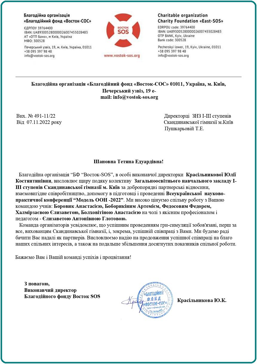 4-5 листопада у місті Ужгород на платформі Zoom пройшла VI Всеукраїнська науково-практична конференція Модель ООН - 2022. ESTDEV – Estonian Centre for International Development. Учні нашого закладу, Єлизавета Халмірзаєва, Федір Федосов, Артемій Боборикін були членами президії та секретаріату, а Генеральним секретарем конференції стала Анастасія Боровик. Також до членів Секретаріату приєднався Ілля Перепічаєв, ученик Криворізького ліцею №119 Криворізької міської ради.